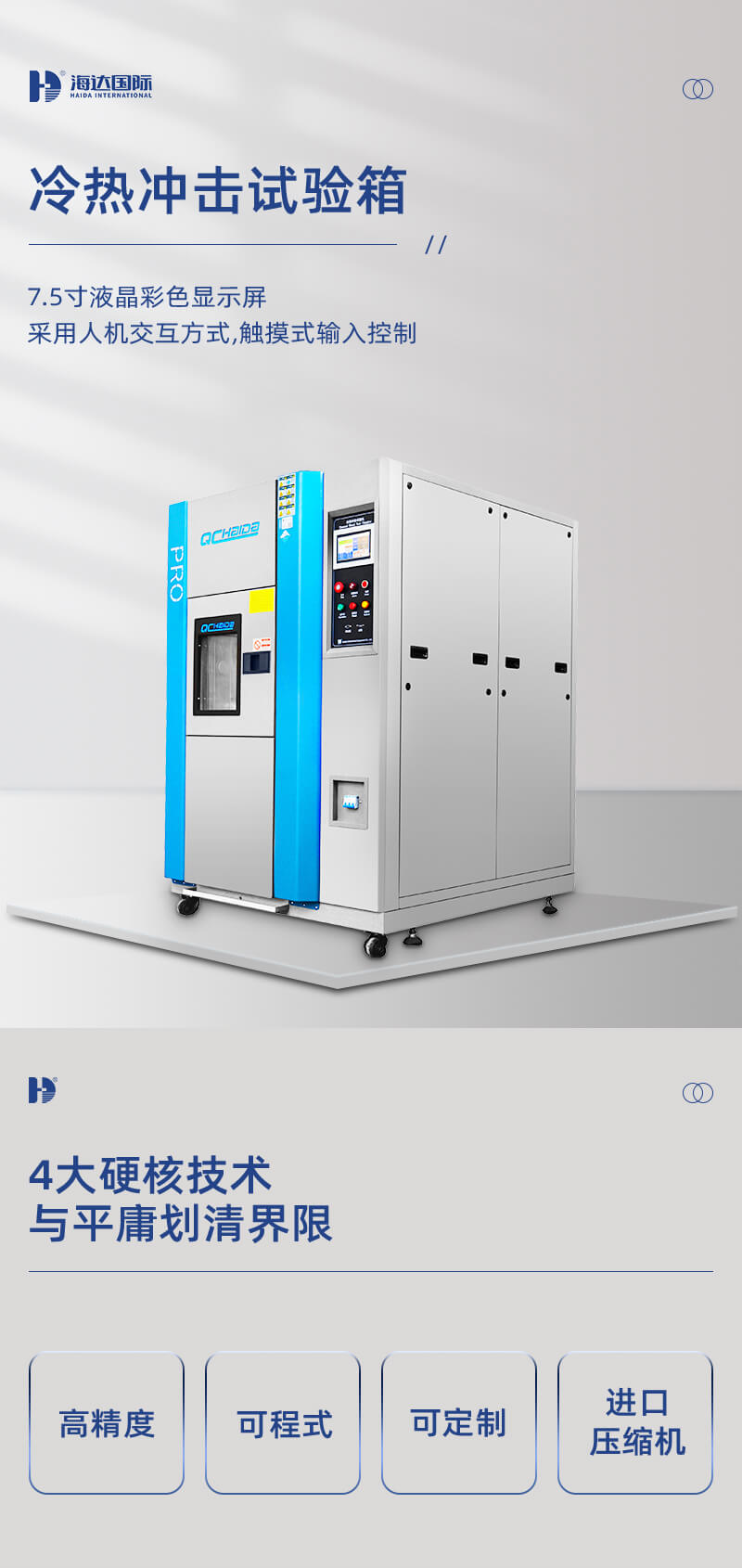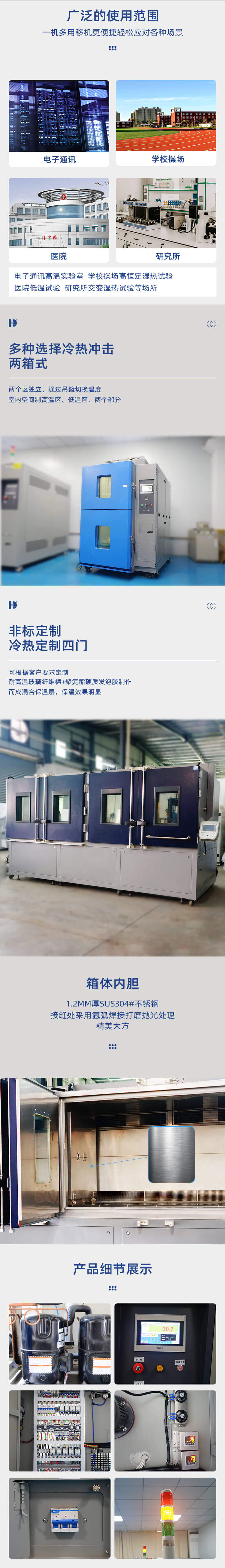 預熱工作室內安裝加熱器、循環風機,內循環風道、溫度監測探頭、風門等;預冷工作室內安裝制冷蒸發器、儲冷片、加熱器、循環風機、內循環風道、溫度監測探頭、風門等;常溫沖擊室安裝有鼓風機、風門、排氣管等;測試工作室安裝有循環空氣導風網孔板、樣品放置托盤、托盤分度架、溫度監測探頭等。預冷、預熱階段常溫沖擊區不工作,高溫區及低溫區氣流進行內循環,快速將預熱區及預冷區空氣溫度達到預設定值;根據需要可選擇高溫或低溫開始沖擊測試。高溫沖擊測試時根據控制器發送指令控制預熱區風門工作,氣流經過測試工作區導風網孔板及測試樣品后返回到預熱區,此時常溫沖擊區不工,低溫區進行內部循環;低溫沖擊測試時根據控制器發送指令控制預冷區風門工作,氣流經過測試工作區導風網孔板及測試樣品后返回到預冷區,此時常溫沖擊區不工,高溫區進行內部循環;常溫沖擊時,根據控制器發送指令控制常溫沖擊區風門及鼓風機工作,鼓風機將設備安裝空間的氣流導入,經過測試工作區導風網孔板及測試樣品同時將測試工作區熱氣流或冷氣流排出室外,此時高溫區與低溫區進行內部循環。根據要求可設置多次循環自動控制;從而達到溫度快速交變和室內溫度均勻分布。 |