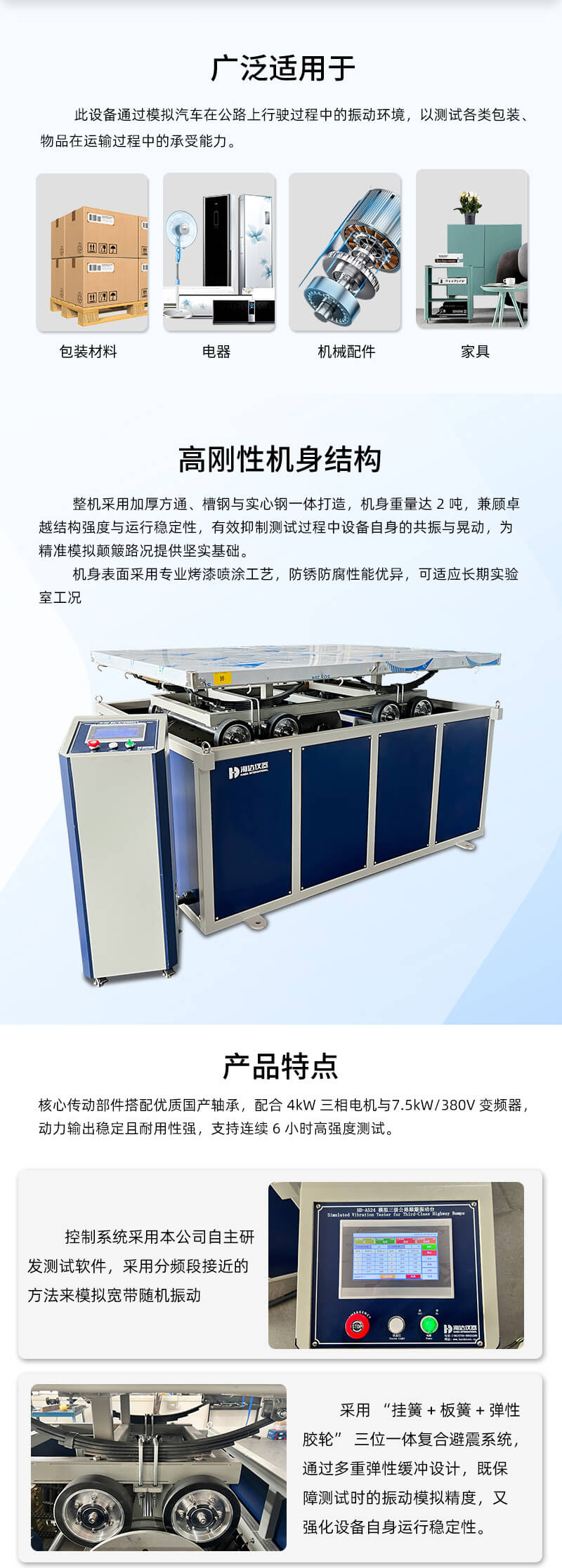 模擬三四級公路顛簸試驗臺對特定負荷的各類物品在公路汽車運輸過程中承受實際路況能力的考核,以在實驗室獲取實際路況對于物品的影響,從而對物品及物品的包裝給予評定或確認的依據。