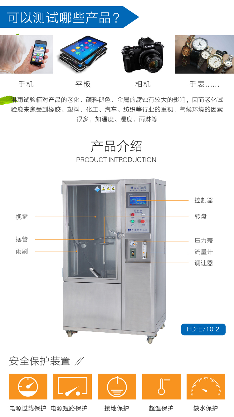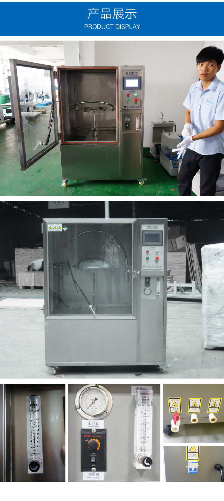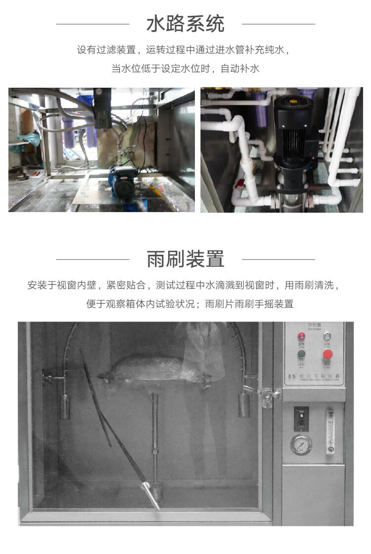 本產(chǎn)品采用科學(xué)設(shè)計(jì),使得該設(shè)備能夠逼真的模擬噴水環(huán)境。采用數(shù)字及變頻控制技術(shù),使得降雨量、試品架的回轉(zhuǎn)角度、噴水?dāng)[桿的擺動(dòng)角度以及擺管的擺動(dòng)頻率都可自動(dòng)的調(diào)節(jié)。