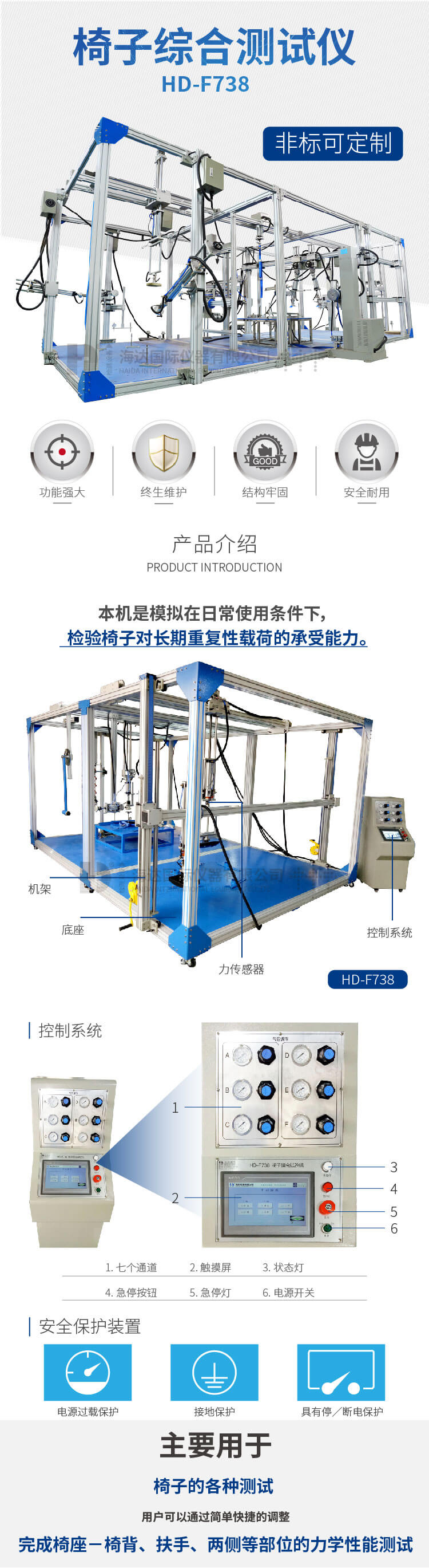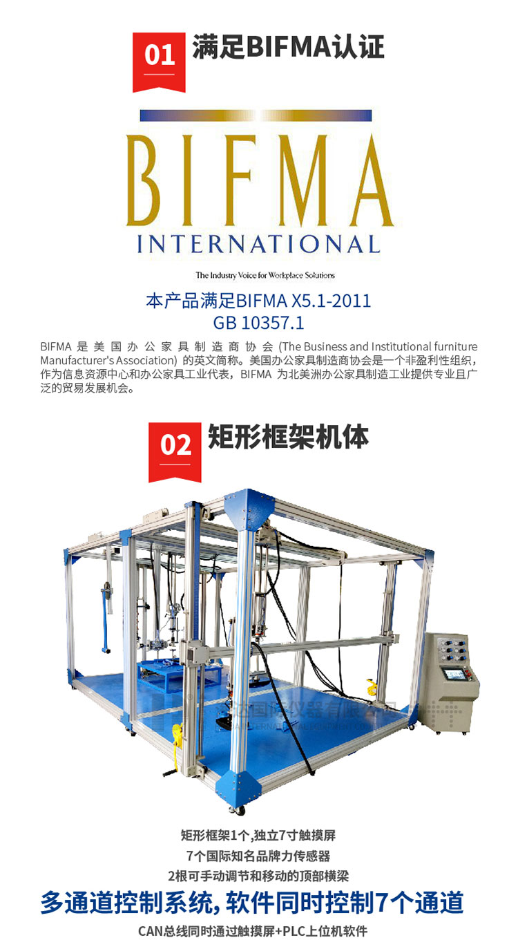 椅子綜合試驗機在同一臺試驗機上可以進行椅子的各種測試,用戶可以通過簡單快捷的調(diào)整,完成椅子椅座、椅背、扶手、兩側等部位的力學性能測試。