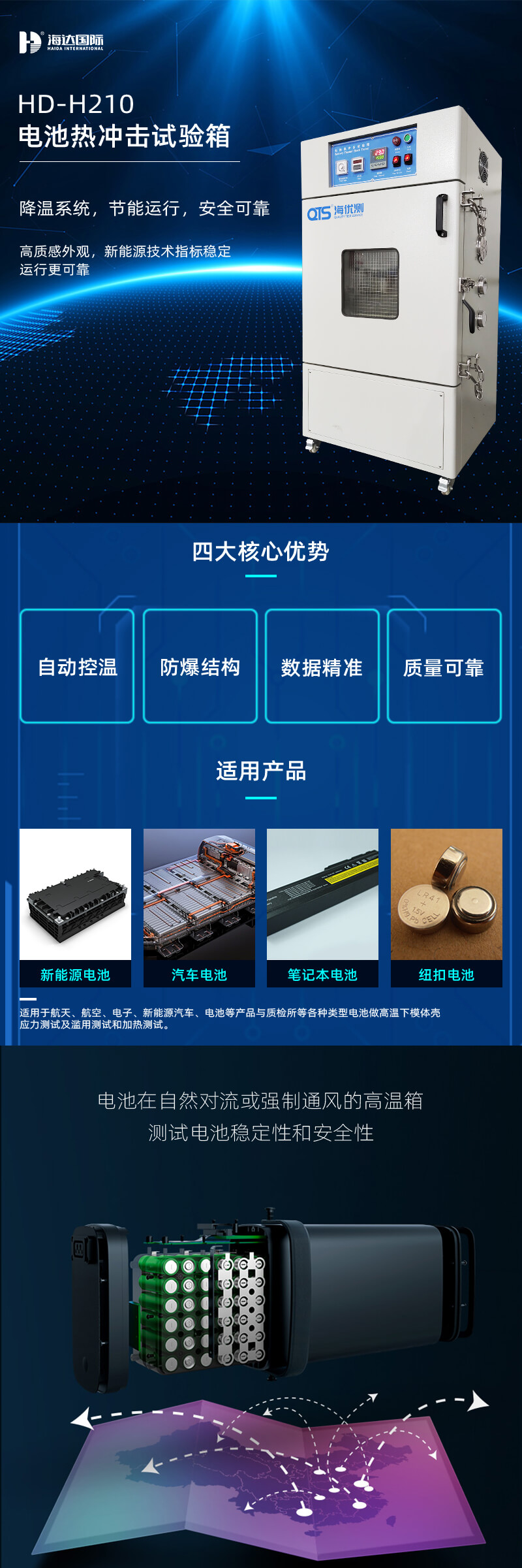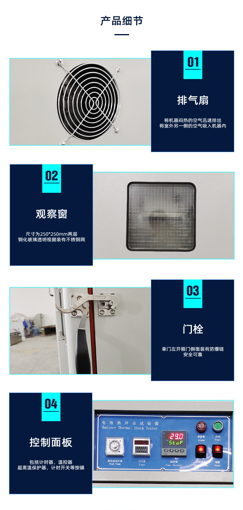 電池熱沖擊試驗箱是模擬電池放置在自然對流或強制通風的高溫箱中,以一定的升溫速率升溫至設定測試溫度并保持一定時間,采用熱風循環系統,可保證工作溫度分布均勻。
